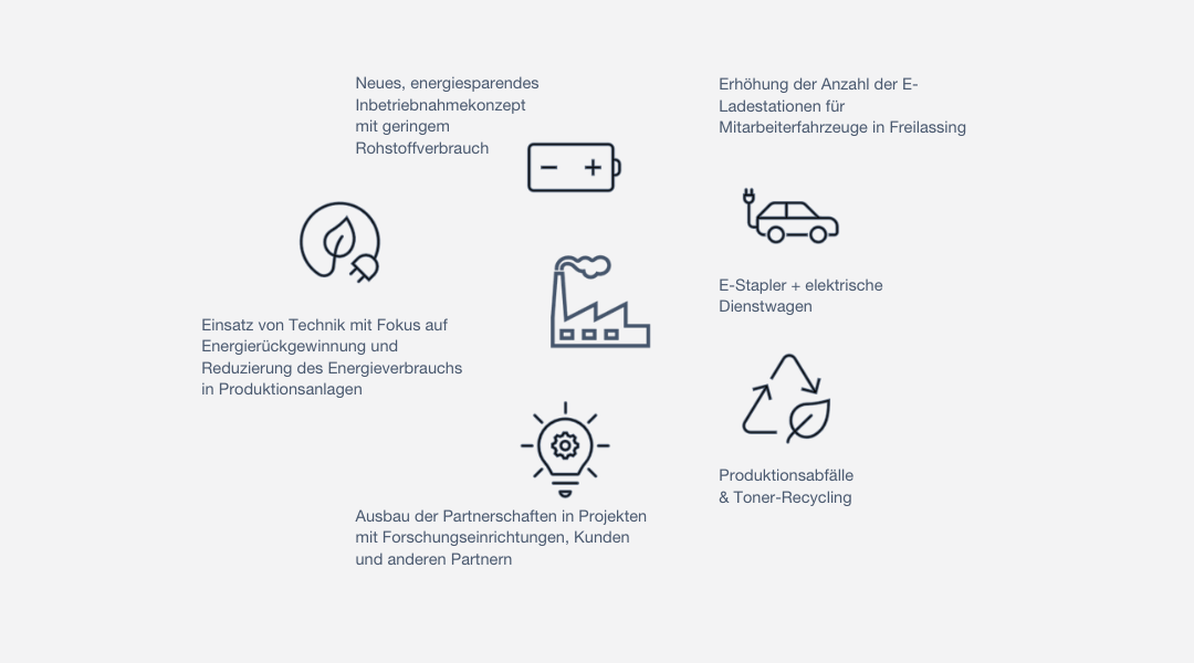 Darüber hinaus haben wir die Product Carbon Footprints (PCF) für unsere Maschinen und Referenzkundenprodukte nach DIN ISO 14067 und GHG Protocol Product Standard ermittelt. Der PCF unterliegt einem jährlichen Überprüfungsprozess.