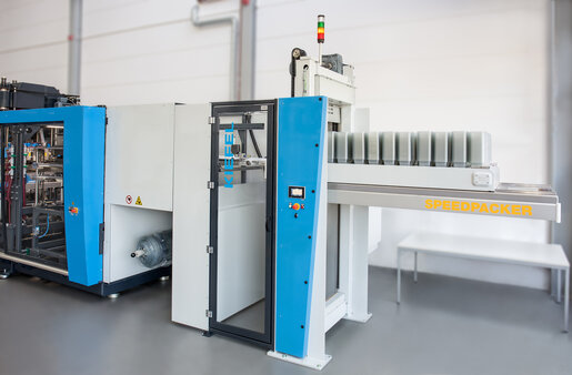 The SPEEDPACKER is a standard automation module for SPEEDFORMER KMD series. The SPEEDPACKER includes an automated shuttle transfer of the finished formed trays. With optimum buffering of the trays, the operator can remove them at an ergonomic height.