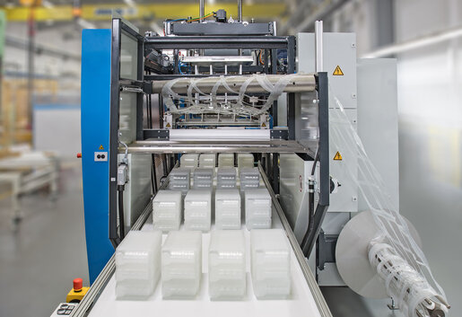 The palletizing unit consists of two palletizing stations. This makes it possible to palletize in one station while the other is being emptied. If the products are not to be packed in cartons, the sleeving module can be used. Here, one or more stacks are packed and shrink-wrapped.